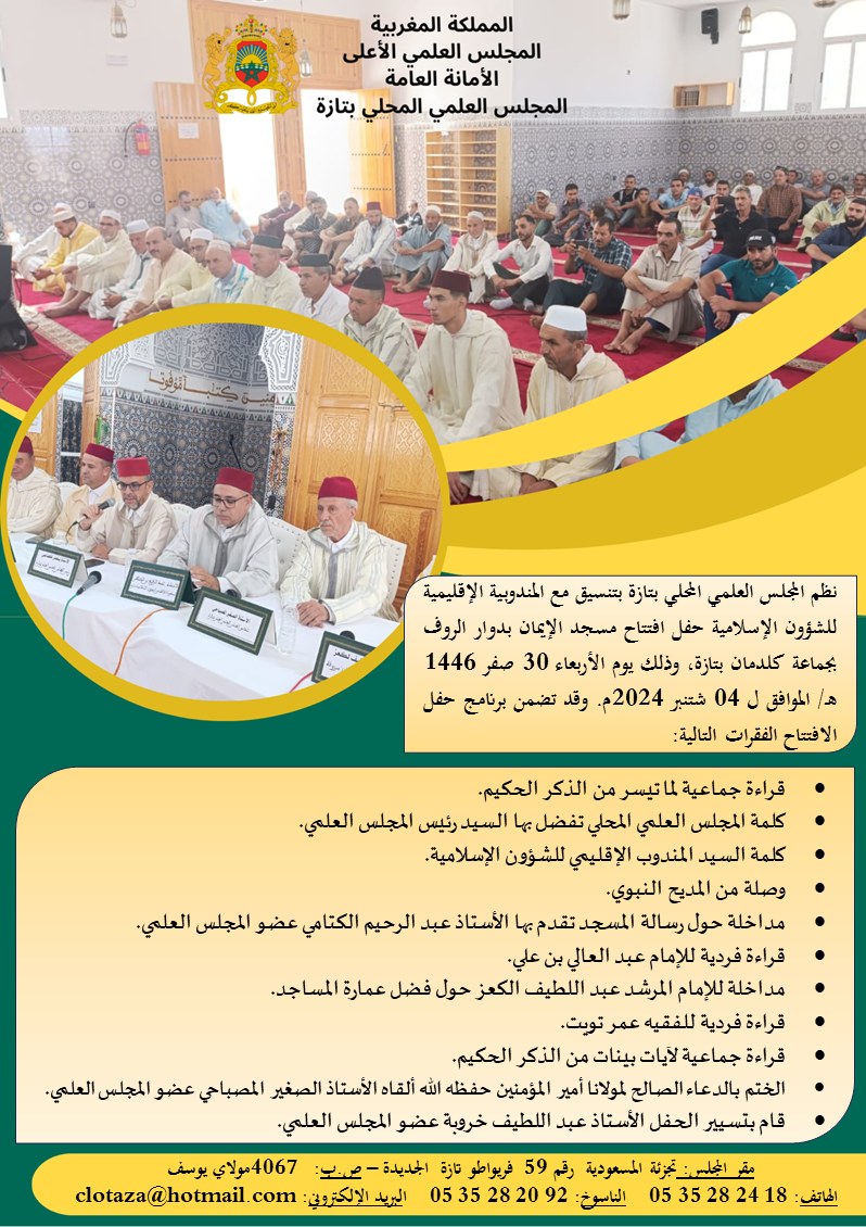 تنزيلا لمقتضيات برنامجه الشهري؛ نظم المجلس العلمي المحلي بتازة بتنسيق مع المندوبية الإقليمية للشؤون الإسلامية بتازة نشاطا علميا، وفق العناصر الآتية: نوع النشاط: مجلس للصلاة على رسول الله صلى الله عليه وسلم المحور: الأنشطة العلمية في السيرة النبوية مكان النشاط وجماعته: المسجد المركزي الزراردة تاريخه: 2026-04-16 توقيته: بين العشائين تأطير: اسماعيل هلال و خالد الرماضي فقرات النشاط: -موعظة عن آثار الصلاة على النبي صلى الله عليه وسلم في حياة المسلم. -الصلاة على رسول الله صلى الله عليه وسلم مائة مرة. الختم بالدعاء الصالح لأمير المؤمنين صاحب الجلالة الملك محمد السادس نصره الله وأيده. إعداد: اسماعيل هلال مراجعة ونشر: يونس العلام