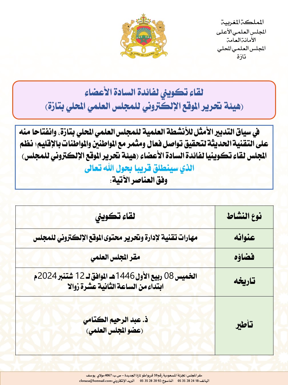 تنزيلا لمقتضيات برنامجه الشهري؛ نظم المجلس العلمي المحلي بتازةممثلا بخلية شؤون المرأة وقضايا الأسرة بتنسيق مع المندوبية الإقليمية للشؤون الإسلامية نشاطا علميا، وفق العناصر الآتية: نوع النشاط: دورة تكوينية المحور: ثابت المذهب المالكي مكان النشاط وجماعته: مسجد الوفاء بأكنول تاريخه: 2026-04-15 توقيته: 15:00 تأطير: كريمة حبوبي عضو المجلس العلمي المحلي بتازة وفريدة حمداني مرشدة دينية فقرات النشاط: الافتتاح بآيات بينات من الذكر الحكيم فضل تجهيز الميت الآداب والشروط التي يجب أن تتلتزم بها المغسلة الأحكام الفقهية الخاصة بتجهيز الميت الشق التطبيقي الختم بالدعاء الصالح لأمير المؤمنين صاحب الجلالة الملك محمد السادس نصره الله وأيده. إعداد: كريمة حبوبي مراجعة ونشر: