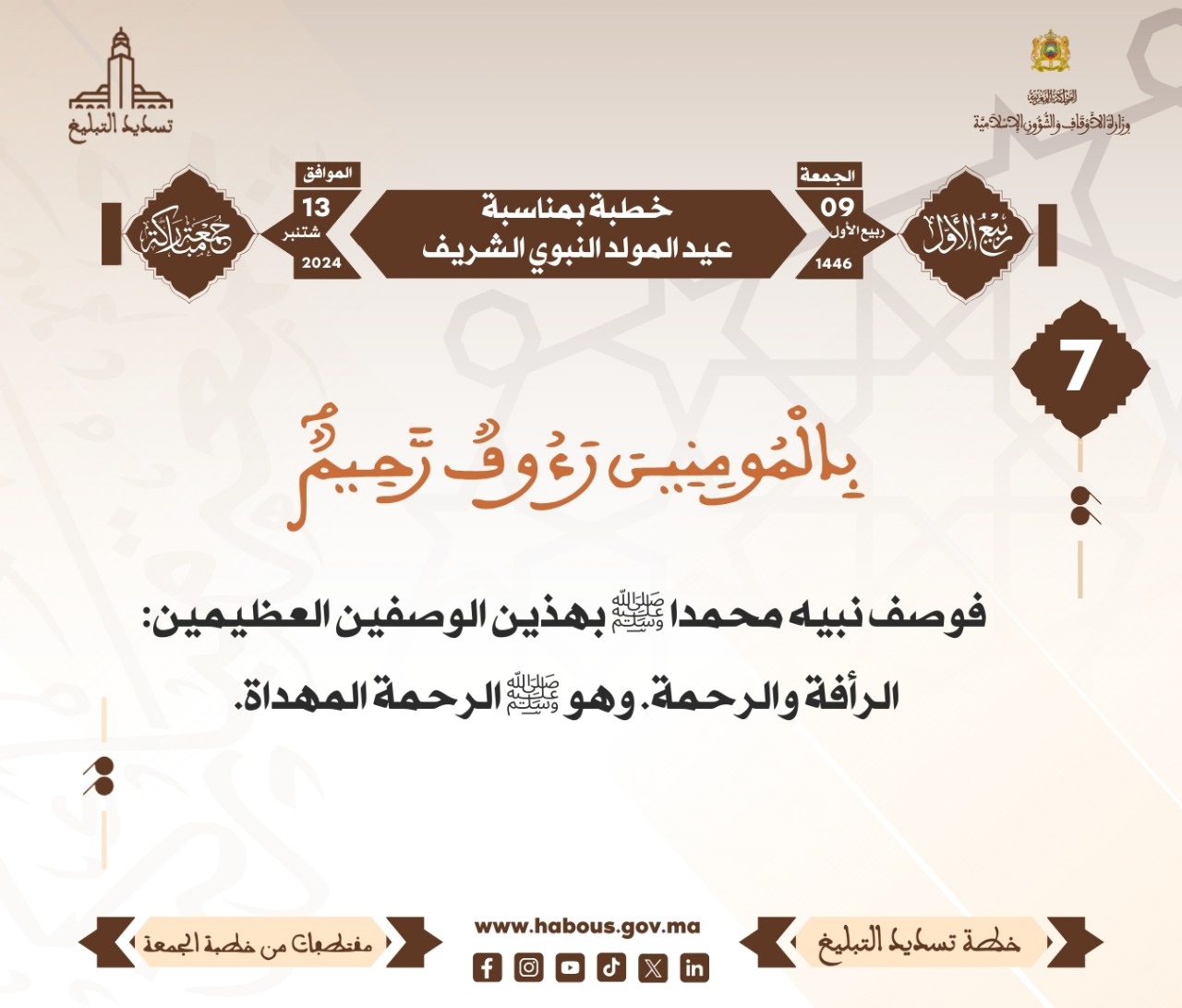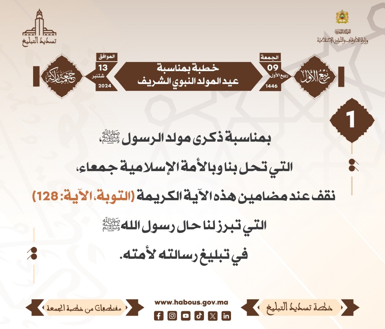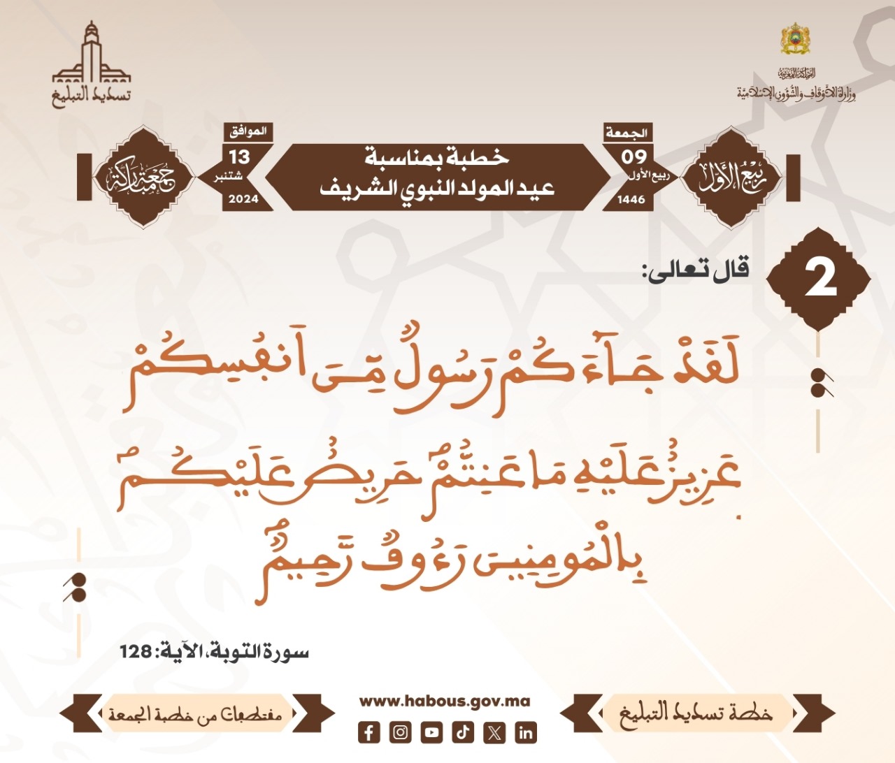 آخر المنشورات:تجربةنشاط في موضوع: مجلس للصلاة على رسول الله صلى الله عليه وسلم (إعداد: اسماعيل هلال)نشاط في موضوع: فن المديح والسماع (إعداد: المرشدة العزيزة ستي)برنامج دروس تسديد التبليغ الخاص بمناطق التجريب : ( ‘ الأسبوع 95 ‘ )،نشاط في موضوع: مجلس للصلاة على رسول الله صلى الله عليه وسلم (إعداد: ذ.عبد الرحيم الكتامي)نشاط في موضوع: من هديه صلى الله عليه وسلم الحرص على النظافة والبيئة (إعداد الإمام المرشد: المهدي الخماس)نشاط في موضوع: قافلة فقهية بمسجد تعاونية فرج الله بوحلو (إعداد: المرشدة عائشة العمري)نشاط في موضوع: مسابقة في السيرة النبوية (إعداد: عزيزة اموينة)نشاط في موضوع: دور النظافة في الوقاية من الأمراض (إعداد: أمينة لوكيل)نشاط في موضوع: دورة تكوينية في “تجهيز الميت وفق المذهب المالكي” (إعداد: كريمة حبوبي)نشاط في موضوع: “قافلة طبية” (إعداد: ذة : فاطمة مزوز عضو المجلس العلمي)نشاط في موضوع: مسابقة في السيرة النبوية (إعداد: الإمام المرشد نبيل بلفضيل)نشاط في موضوع: تقنيات استعمال منظومة المؤطر (ة) (إعداد: عبد الرحيم الكتامي)نشاط في موضوع: السيرة النبوية وتعميق الوعي والفعالية المجتمعية (إعداد: الإمام المرشد ذ الراضي بزياز)نشاط في موضوع: مسابقة في السيرة النبوية (إعداد: الإمام المرشد عثمان بن الشيخ)نشاط في موضوع: خطورة آفات اللسان (إعداد: كريمة حبوبي)نشاط في موضوع: مسابقة في السيرة النبوية (إعداد: بشرى أوشباب)مسابقة في : السيرة النبوية (إعداد: العزيزة ستي)نشاط في موضوع: دورة تكوينية في تجهيز الميت (إعداد: المرشدة امينة الشنافي)محاضرة بعنوان: لماذا لا نشعر بالراحة؟ قراءة في السكينة من الهدي النبوي (إعداد: خديجة الصغير)نشاط في موضوع: عمل اجتماعي (إعداد: ذة : فاطمة مزوز عضو المجلس العلمي)نشاط في موضوع:المسابقة الختامية للأيام الدراسية في السيرة النبوية الشريفة (إعداد: محمد فونونو)نشاط في موضوع: من هديه صلى الله عليه وسلم الحرص على الطهارة والنظافة (إعداد: المرشد: المهدي الخماس)نشاط في موضوع: هدي النبي ﷺ في شمولية العبادة وأثرها في المعاملة (إعداد: اسماعيل هلال)نشاط في موضوع: الكسب الحلال (إعداد: ذة : فاطمة مزوز عضو المجلس العلمي)نشاط في موضوع: ماذا بعد رمضان (إعداد: صباح وردي)نشاط في موضوع: مسابقة في السيرة النبوية (إعداد: الإمام المرشد عبد الرزاق العمراني)برنامج دروس تسديد التبليغ الخاص بمناطق التجريب : ( ‘ الأسبوع 94 ‘ )نشاط في موضوع: تفسير و تدبر آيات الأحكام من سورة النساء (إعداد: كريمة حبوبي)محاضرة علمية تحت عنوان : ” من الذكريات الوطنية معركتا : الهري و بوڭافر”.خطبة الجمعة ليوم 22 شوال 1447هـ الموافق لـ 10 أبريل 2026م السيرة النبوية مصدر لتدبير الشأن العام كتابة النبي ﷺ لوثيقة المدينة (الصحيفة)نشاط في موضوع: هدي الرسول صلى الله عليه وسلم في النظافة (إعداد: الإمام المرشد عبد الرزاق العمراني)نشاط في موضوع: لقاء تواصلي مع الساكنة (إعداد: عمر الحميدي)آيات بينات من سورة الصافات من الآية 83 إلى الآية 144نشاط في موضوع: المسابقة الختامية للأيام الدراسية في السيرة النبوية الشريفة (إعداد: المنسقة فاطنة حمويي)نشاط في موضوع: السيرة النبوية وتعميق الوعي والفعالية المجتمعية (إعداد: المرشد: المهدي الخماس)نشاط في موضوع: السيرة النبوية وتعميق الوعي والفعالية المجتمعية (إعداد: المرشد: المهدي الخماس)نشاط في موضوع: هديه صلى الله عليه وسلم في الطهارة وحثه عليهانشاط في موضوع: محبة الرسول صلى الله عليه وسلم (إعداد: كريم عوشو)تقرير عن الاجتماع الشهري مع السادة المرشدين و السيدات المرشدات بمقر المجلس العلمي المحلي بتازةنشاط في موضوع: السيرة النبوية وبناء شخصية وسطية ومتوازنة (إعداد: مليكة الفقوسي)درس وعظي :السيرة النبوية مصدر لتدبير الشأن العام ” بناء المسجد النبوي ” (إعداد: ذة : فاطمة مزوز عضو المجلس العلمي)نشاط في موضوع: تكريم الإسلام المرأة (إعداد: ذة : فاطمة مزوز عضو المجلس العلمي)برنامج دروس تسديد التبلي