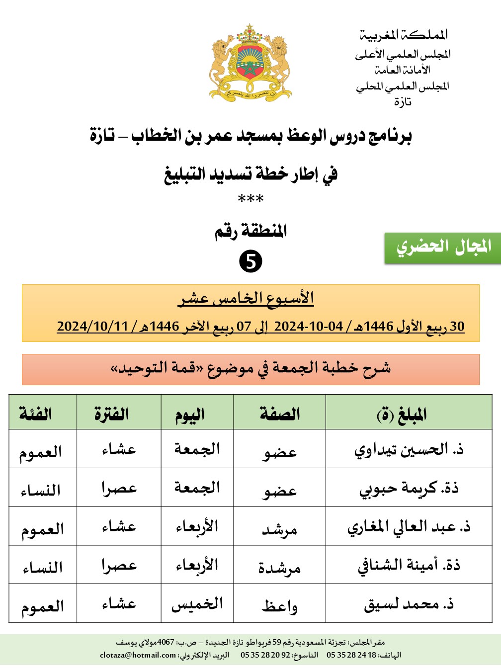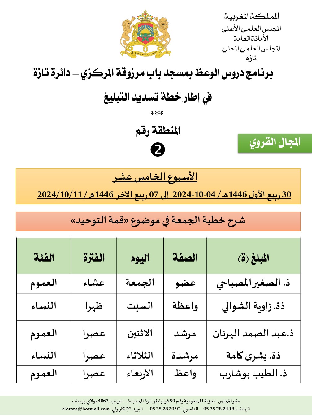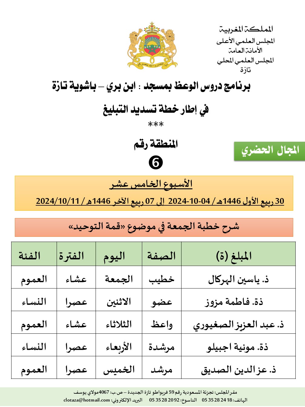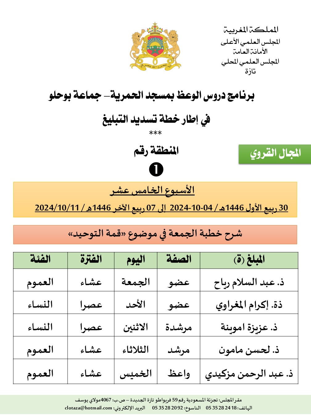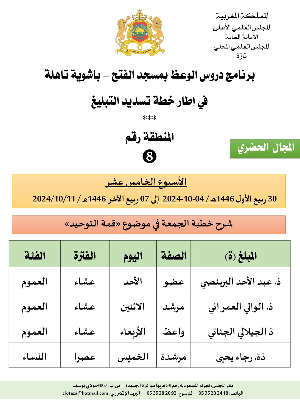 تنزيلا لمقتضيات برنامجه الشهري والسنوي وتخليدا لمرور خمسة عشر قرنا على مولاد الرسول صلى الله عليه وسلم؛ نظم المجلس العلمي المحلي بتازة بتنسيق مع المديرية الإقليمية للشؤون الإسلامية بتازة نشاطا علميا، وفق العناصر الآتية: نوع النشاط: محاضرة المحور: الأنشطة العلمية في السيرة النبوية مكان النشاط وجماعته: مسجد أهل مولة – جماعة تايناست تاريخه: 2026-04-17 توقيته: ظهرا تأطير: المرشد :عبدالمجيد المغاري فقرات النشاط: -أهمية السيرة النبوية في حياتنا؛ – محبة النبي صلى الله عليه وسلم تتجلى في الاقتداء به في جميع مجالات الحياة؛ -أمثلة ونماذج مشرقة من أخلاق النبي صلى الله عليه وسلم (العفو والتسامح) الختم بالدعاء الصالح لأمير المؤمنين صاحب الجلالة الملك محمد السادس نصره الله وأيده. إعداد: عبدالمجيد المغاري