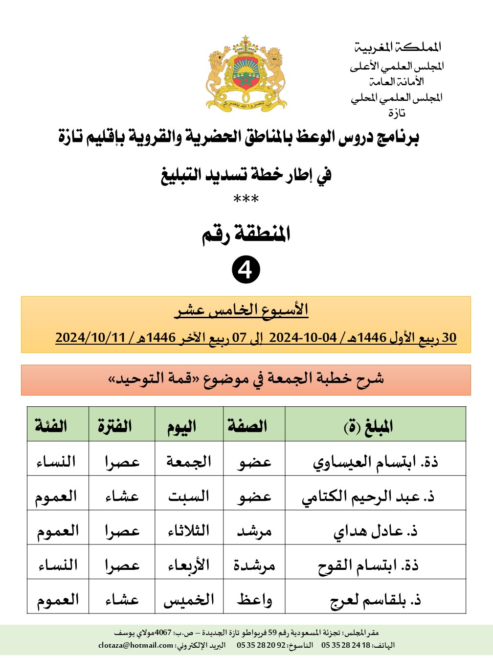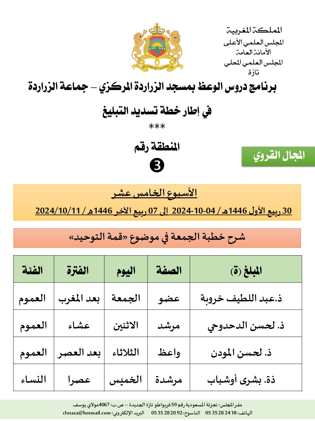 تنزيلا لمقتضيات برنامجه الشهري؛ نظم المجلس العلمي المحلي بتازة بتنسيق مع المديرية الإقليمية للتعاون الوطني نشاطا علميا، وفق العناصر الآتية: نوع النشاط: ندوة المحور: الأنشطة العلمية في السيرة النبوية مكان النشاط وجماعته: دار الفتاة تاهلة تاريخه: 2026-04-16 توقيته: 18:30 مساء تأطير: الأستاذة مليكة الفقوسي والأستاذة مارية بورايس والأستاذة منسقة المرشدات فاطنة حمويي. فقرات النشاط: -الافتتاح بآيات بينات من الذكر الحكيم – المحور الأول:ماهي الزينة التي يراها الله قبل الناس؟للاستاذة مليكة الفقوسي. – المحور الثاني:الأخلاق النبوية التي تتزين بها الفتاة المسلمة للأستاذة مارية بورايس. – المحور الثالث:الأثر المترتب على التحلي بالأخلاق النبوية.للاستاذة فاطنة حمويي. – نسقت بين فقرات النشاط الأستاذة فاطنة حمويي. الختم بالدعاء الصالح لأمير المؤمنين صاحب الجلالة الملك محمد السادس نصره الله وأيده. إعداد: مليكة الفقوسي