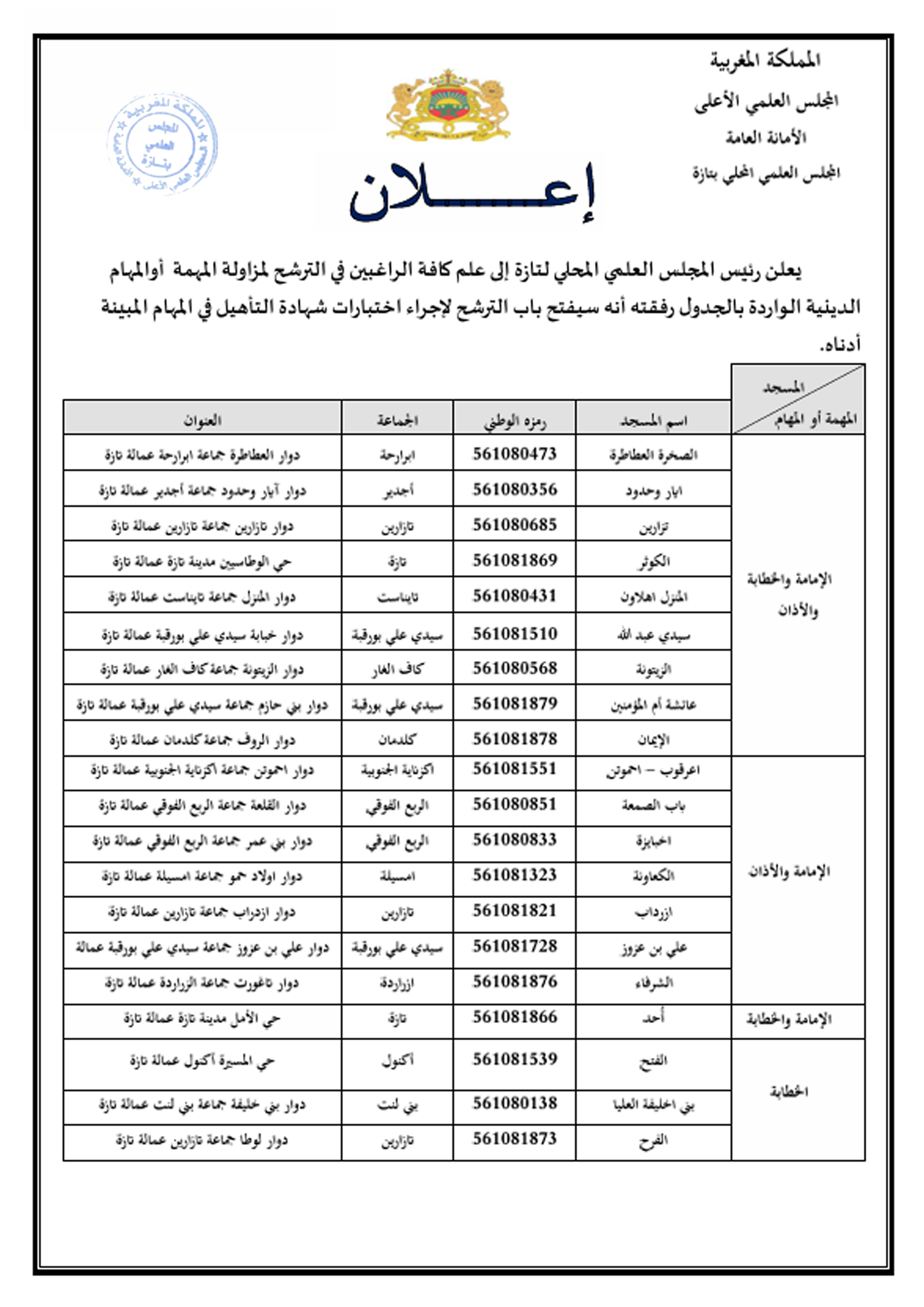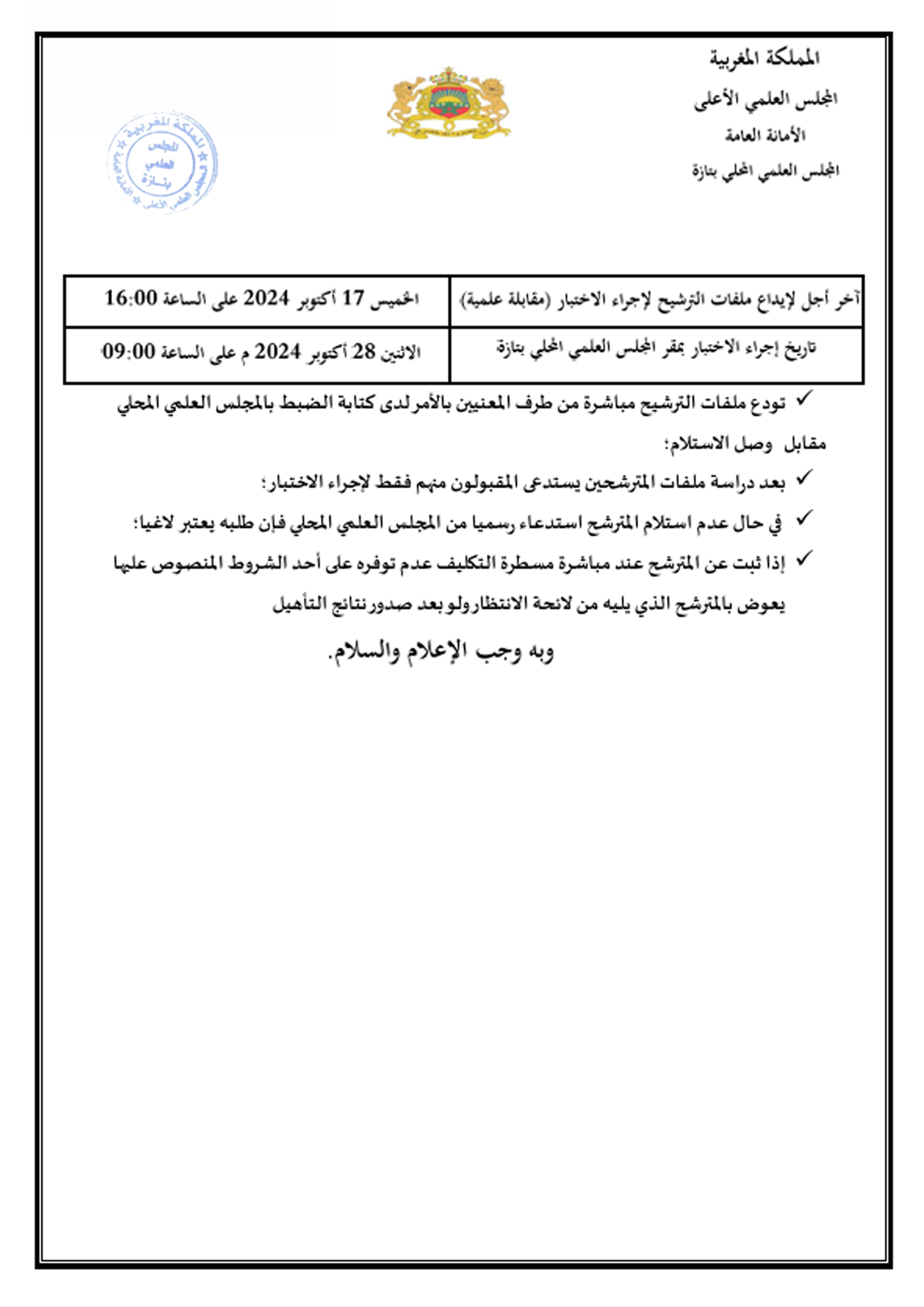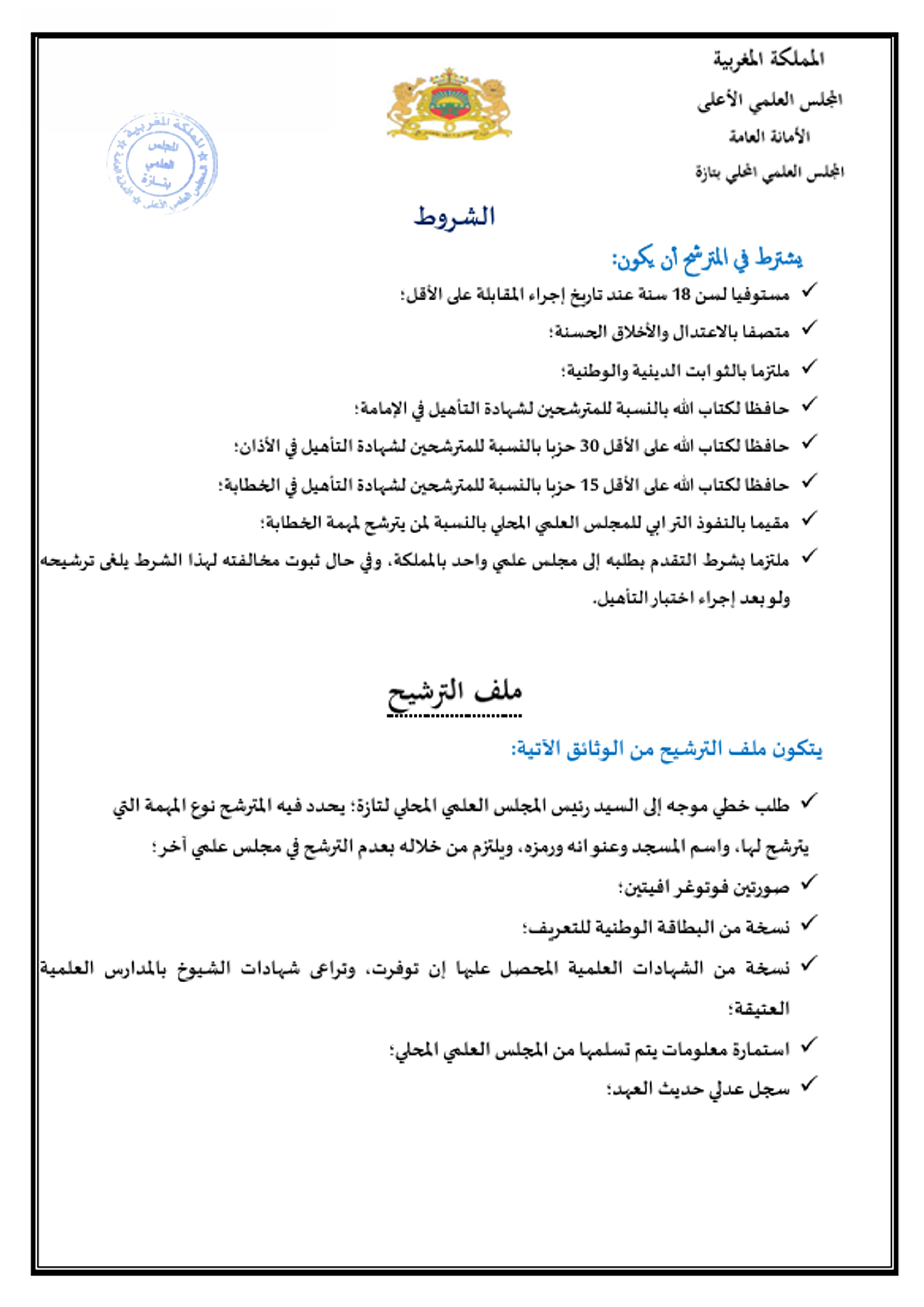 آخر المنشورات:نشاط في موضوع: مجلس للصلاة على رسول الله صلى الله عليه وسلم (إعداد: اسماعيل هلال)نشاط في موضوع: فن المديح والسماع (إعداد: المرشدة العزيزة ستي)برنامج دروس تسديد التبليغ الخاص بمناطق التجريب : ( ‘ الأسبوع 95 ‘ )،نشاط في موضوع: مجلس للصلاة على رسول الله صلى الله عليه وسلم (إعداد: ذ.عبد الرحيم الكتامي)نشاط في موضوع: من هديه صلى الله عليه وسلم الحرص على النظافة والبيئة (إعداد الإمام المرشد: المهدي الخماس)نشاط في موضوع: قافلة فقهية بمسجد تعاونية فرج الله بوحلو (إعداد: المرشدة عائشة العمري)نشاط في موضوع: مسابقة في السيرة النبوية (إعداد: عزيزة اموينة)نشاط في موضوع: دور النظافة في الوقاية من الأمراض (إعداد: أمينة لوكيل)نشاط في موضوع: دورة تكوينية في “تجهيز الميت وفق المذهب المالكي” (إعداد: كريمة حبوبي)نشاط في موضوع: “قافلة طبية” (إعداد: ذة : فاطمة مزوز عضو المجلس العلمي)نشاط في موضوع: مسابقة في السيرة النبوية (إعداد: الإمام المرشد نبيل بلفضيل)نشاط في موضوع: تقنيات استعمال منظومة المؤطر (ة) (إعداد: عبد الرحيم الكتامي)نشاط في موضوع: السيرة النبوية وتعميق الوعي والفعالية المجتمعية (إعداد: الإمام المرشد ذ الراضي بزياز)نشاط في موضوع: مسابقة في السيرة النبوية (إعداد: الإمام المرشد عثمان بن الشيخ)نشاط في موضوع: خطورة آفات اللسان (إعداد: كريمة حبوبي)نشاط في موضوع: مسابقة في السيرة النبوية (إعداد: بشرى أوشباب)مسابقة في : السيرة النبوية (إعداد: العزيزة ستي)نشاط في موضوع: دورة تكوينية في تجهيز الميت (إعداد: المرشدة امينة الشنافي)محاضرة بعنوان: لماذا لا نشعر بالراحة؟ قراءة في السكينة من الهدي النبوي (إعداد: خديجة الصغير)نشاط في موضوع: عمل اجتماعي (إعداد: ذة : فاطمة مزوز عضو المجلس العلمي)نشاط في موضوع:المسابقة الختامية للأيام الدراسية في السيرة النبوية الشريفة (إعداد: محمد فونونو)نشاط في موضوع: من هديه صلى الله عليه وسلم الحرص على الطهارة والنظافة (إعداد: المرشد: المهدي الخماس)نشاط في موضوع: هدي النبي ﷺ في شمولية العبادة وأثرها في المعاملة (إعداد: اسماعيل هلال)نشاط في موضوع: الكسب الحلال (إعداد: ذة : فاطمة مزوز عضو المجلس العلمي)نشاط في موضوع: ماذا بعد رمضان (إعداد: صباح وردي)نشاط في موضوع: مسابقة في السيرة النبوية (إعداد: الإمام المرشد عبد الرزاق العمراني)برنامج دروس تسديد التبليغ الخاص بمناطق التجريب : ( ‘ الأسبوع 94 ‘ )نشاط في موضوع: تفسير و تدبر آيات الأحكام من سورة النساء (إعداد: كريمة حبوبي)محاضرة علمية تحت عنوان : ” من الذكريات الوطنية معركتا : الهري و بوڭافر”.خطبة الجمعة ليوم 22 شوال 1447هـ الموافق لـ 10 أبريل 2026م السيرة النبوية مصدر لتدبير الشأن العام كتابة النبي ﷺ لوثيقة المدينة (الصحيفة)نشاط في موضوع: هدي الرسول صلى الله عليه وسلم في النظافة (إعداد: الإمام المرشد عبد الرزاق العمراني)نشاط في موضوع: لقاء تواصلي مع الساكنة (إعداد: عمر الحميدي)آيات بينات من سورة الصافات من الآية 83 إلى الآية 144نشاط في موضوع: المسابقة الختامية للأيام الدراسية في السيرة النبوية الشريفة (إعداد: المنسقة فاطنة حمويي)نشاط في موضوع: السيرة النبوية وتعميق الوعي والفعالية المجتمعية (إعداد: المرشد: المهدي الخماس)نشاط في موضوع: السيرة النبوية وتعميق الوعي والفعالية المجتمعية (إعداد: المرشد: المهدي الخماس)نشاط في موضوع: هديه صلى الله عليه وسلم في الطهارة وحثه عليهانشاط في موضوع: محبة الرسول صلى الله عليه وسلم (إعداد: كريم عوشو)تقرير عن الاجتماع الشهري مع السادة المرشدين و السيدات المرشدات بمقر المجلس العلمي المحلي بتازةنشاط في موضوع: السيرة النبوية وبناء شخصية وسطية ومتوازنة (إعداد: مليكة الفقوسي)درس وعظي :السيرة النبوية مصدر لتدبير الشأن العام ” بناء المسجد النبوي ” (إعداد: ذة : فاطمة مزوز عضو المجلس العلمي)نشاط في موضوع: تكريم الإسلام المرأة (إعداد: ذة : فاطمة مزوز عضو المجلس العلمي)برنامج دروس تسديد التبليغتلاو